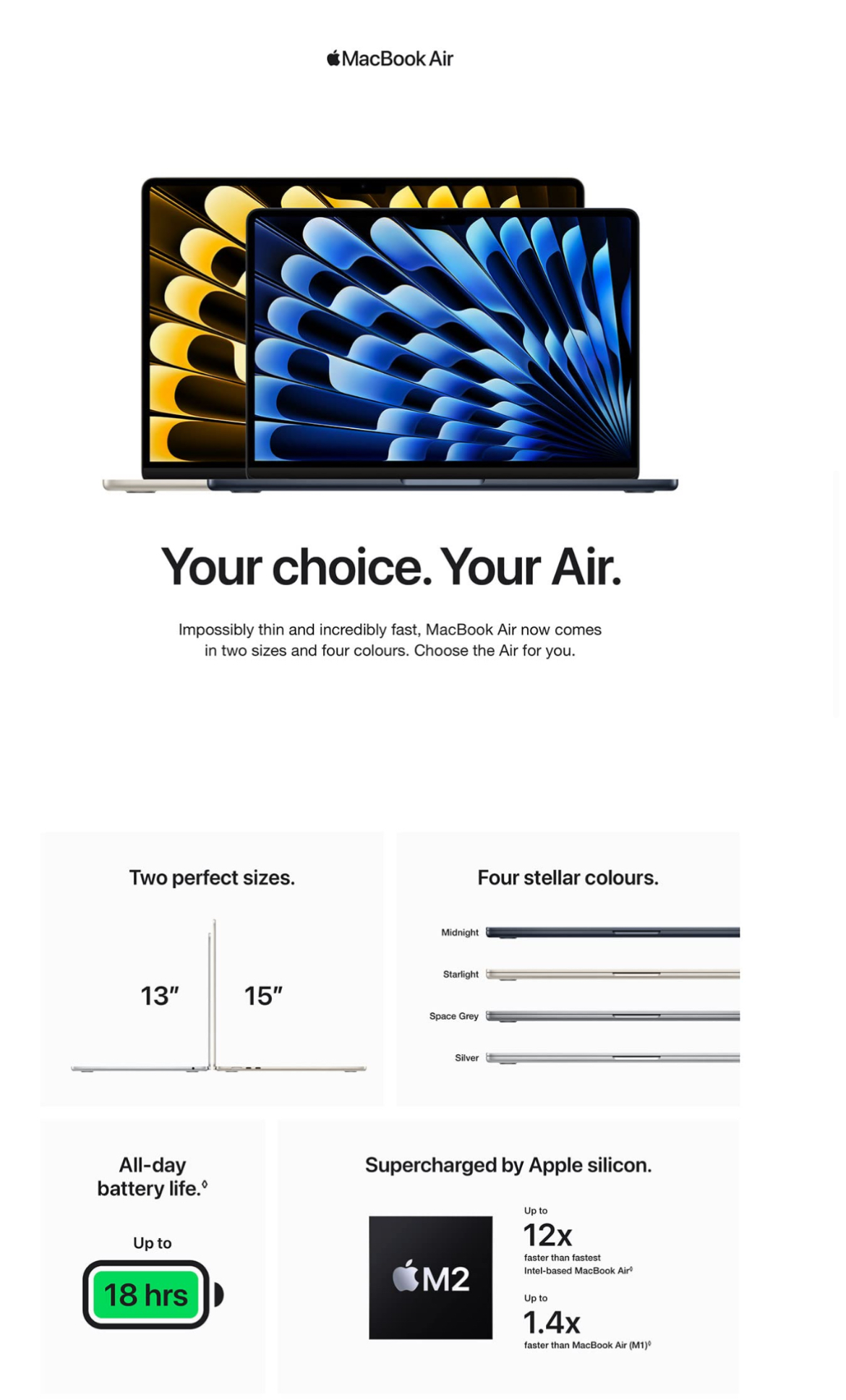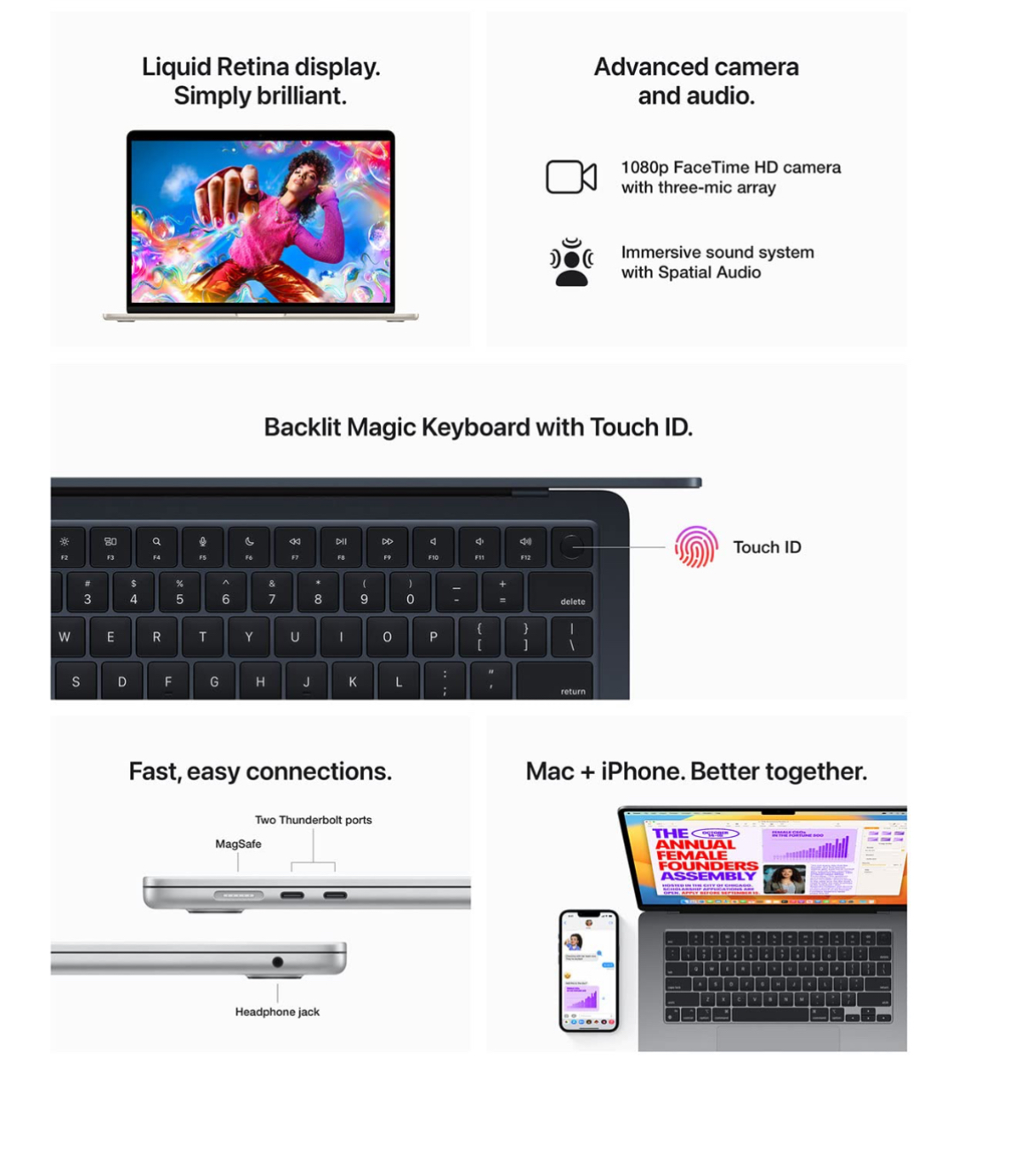 13.6inch Liquid Retina display supports 1 billion colours, so you can enjoy rich contrast and sharp detail in photos, videos and text. And with its 11mm-thin form factor, the lightweight, fanless design means you can take MacBook Air with you, everywhere.